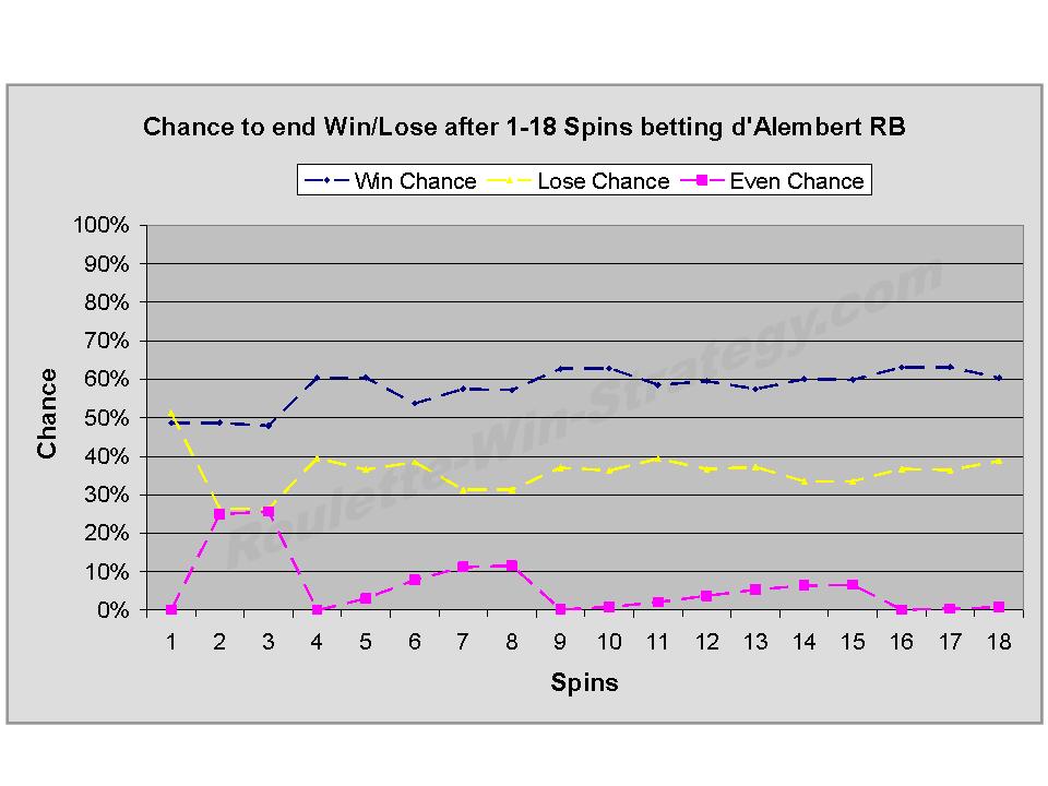 The graph below shows the chance to come out winning with the d'Alembert Red/Black strategy for 1 - 18 spins.