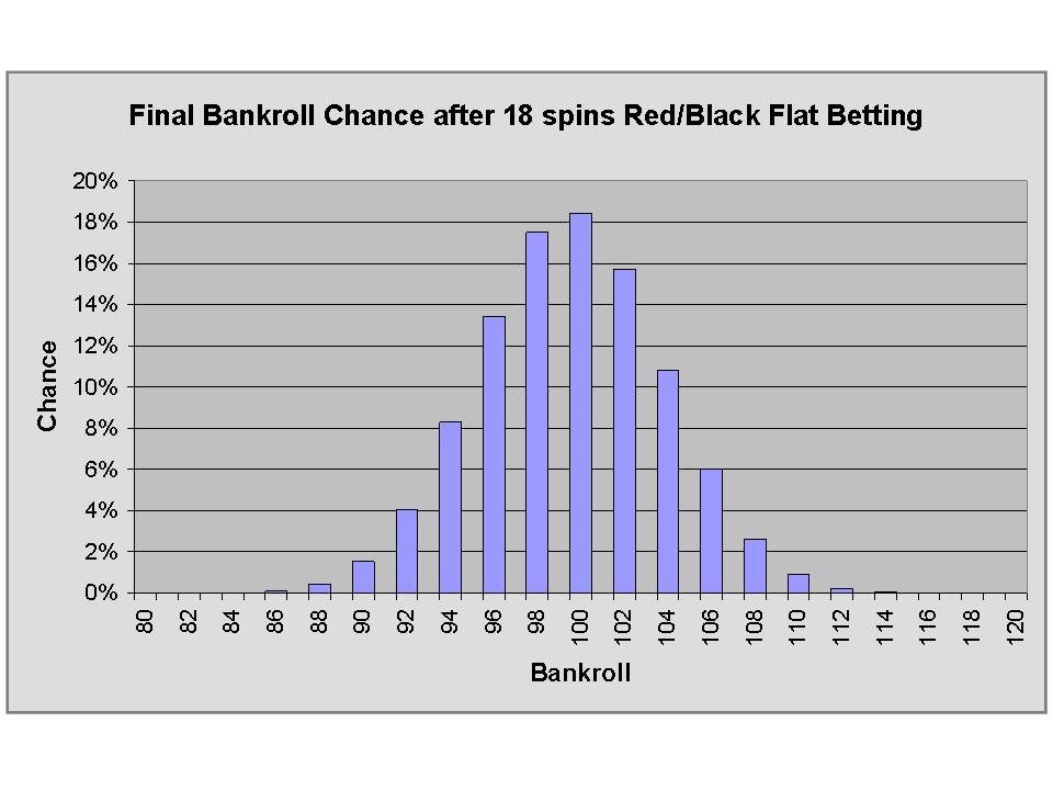 The chance of playing even (‘100’ on the graph) after 18 spins is 18%.