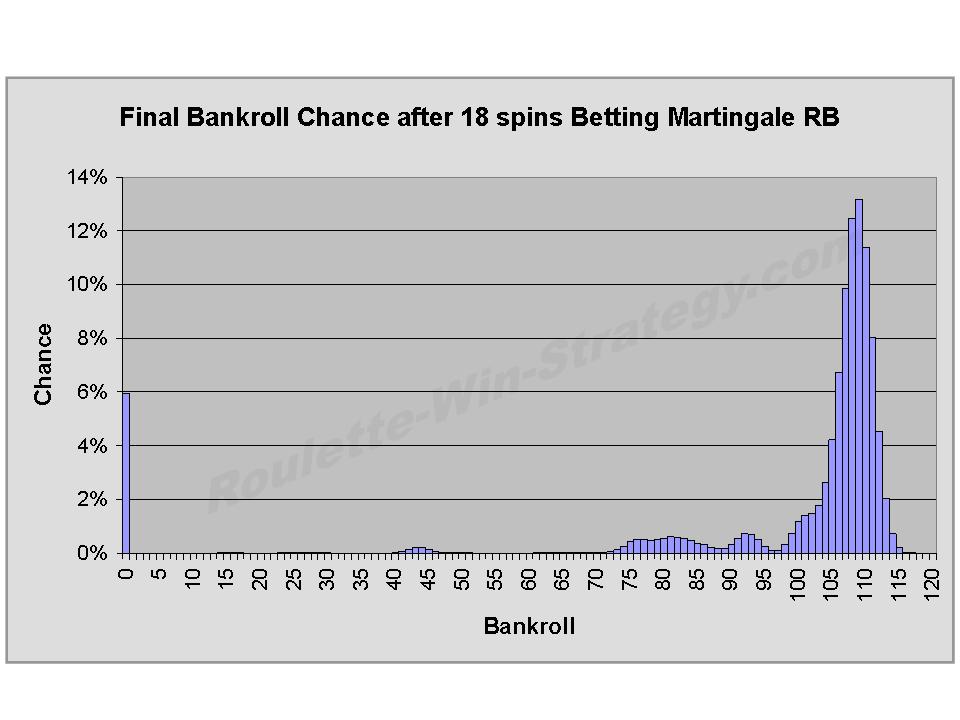 Below the chance graph is shown for using the Martingale system on Red/Black bets after 18 roulette spins.
