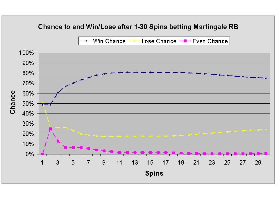 After 30 spins the chance to come out winning has dropped to 75%. Clearly this is due to the fact that the longer you play,