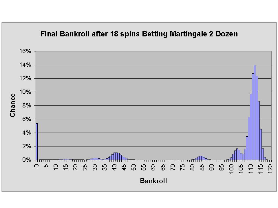 Below the chance graph is shown for using the Martingale system on 2 Dozens/Columns after 18 roulette spins.