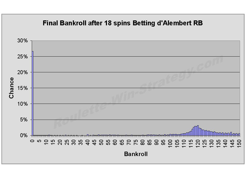 Below the chance graph is shown for using the d'Alembert system on Red/Black bet after 18 roulette spins, with a starting bet