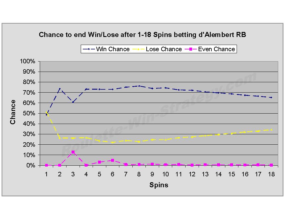The graph below shows the chance to come out winning with the d'Alembert Red/Black strategy for 1 - 18 spins.