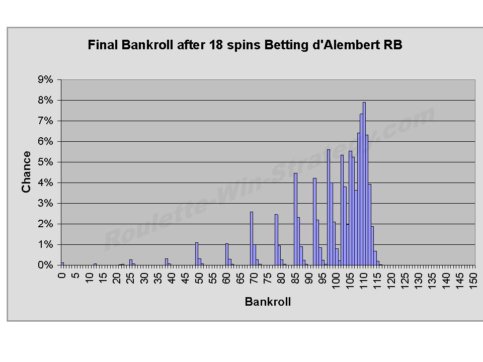 Below the chance graph is shown for using the d'Alembert system on Red/Black bet after 18 roulette spins, with a starting bet